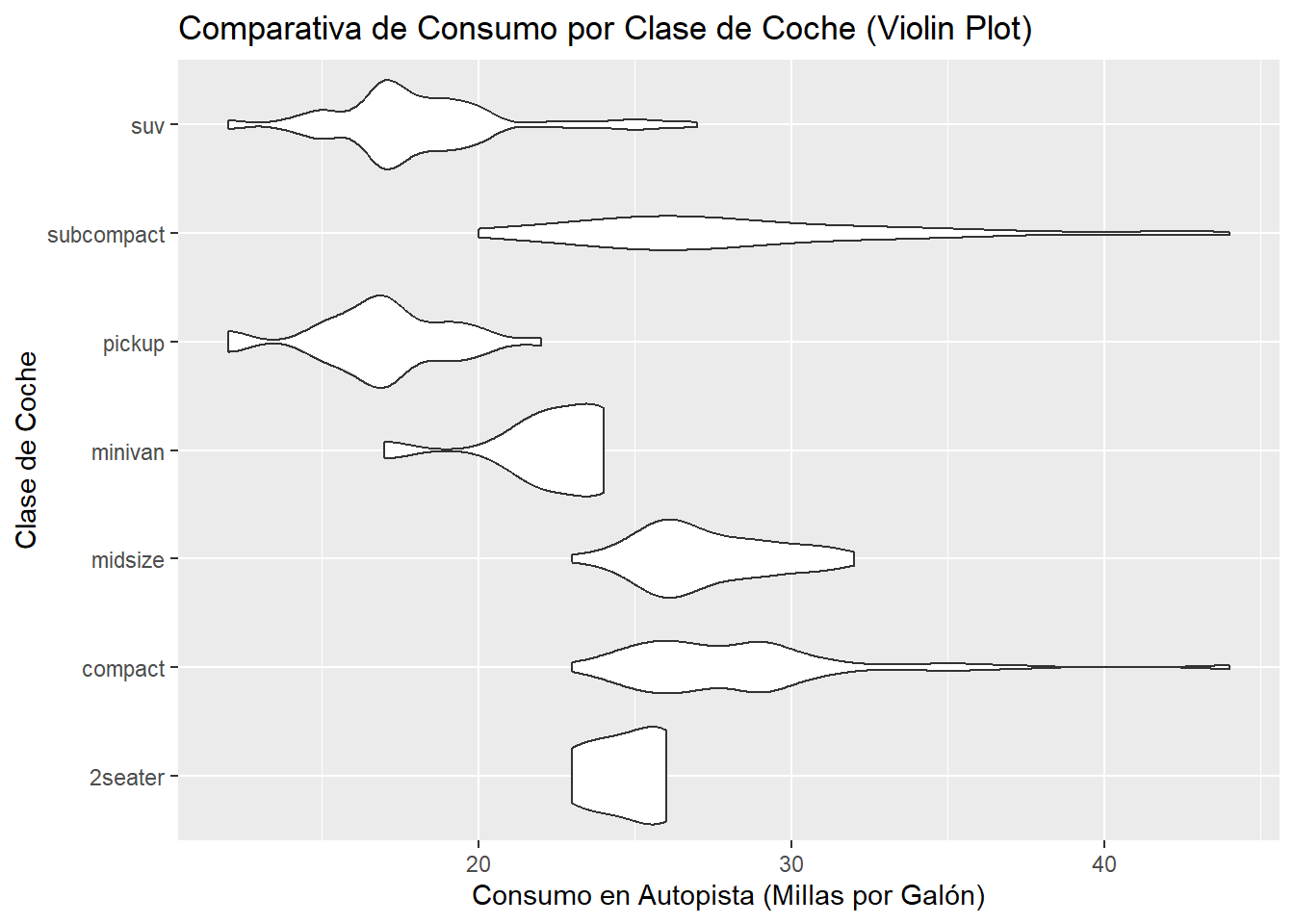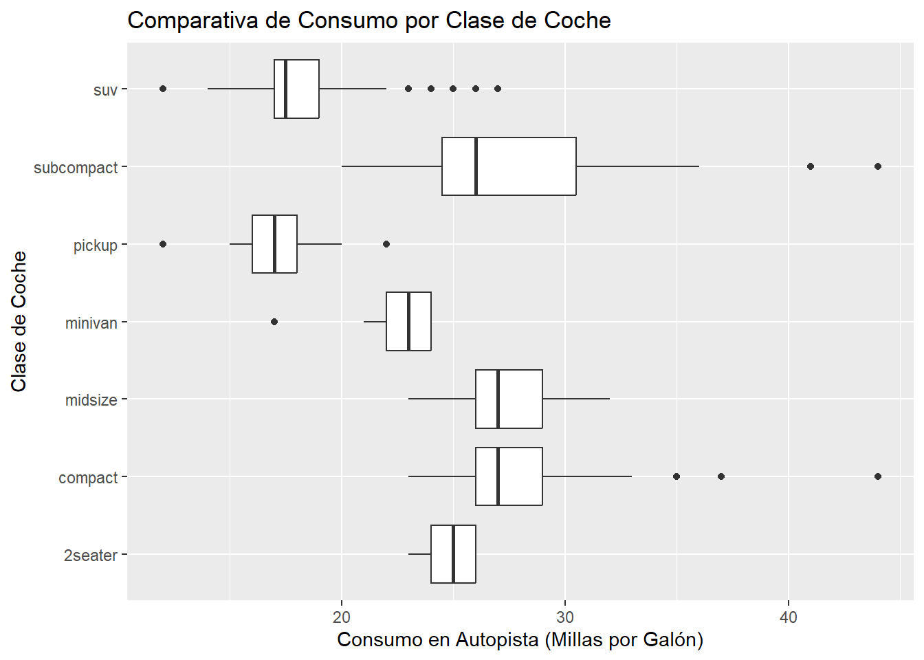 Esta visualización es muy rica. De un vistazo podemos concluir: * Medianas: Los coches compactos (compact) y subcompactos (subcompact) tienen las medianas de consumo más altas (son más eficientes). * Dispersión: La clase suv tiene una dispersión enorme (la caja es muy alta), lo que indica una gran variabilidad en la eficiencia de los SUVs. * Outliers: Hay varios outliers, especialmente un minivan con un consumo inusualmente bajo.