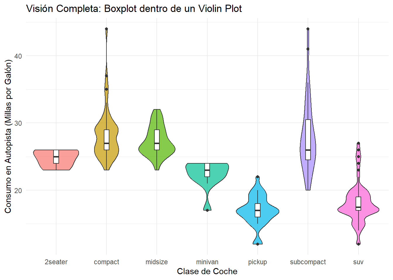 compact y midsize no es simétrica; tiene dos picos (es bimodal). Esto podría indicar que hay dos subgrupos de coches dentro de esas clases.suv está claramente sesgada hacia valores más bajos (menos eficientes).¿Y si no queremos elegir? ¿Y si queremos la robustez estadística del boxplot y la riqueza visual del violin plot? Con ggplot2, podemos tenerlo todo. Simplemente, añadimos ambas geometrías al mismo gráfico.