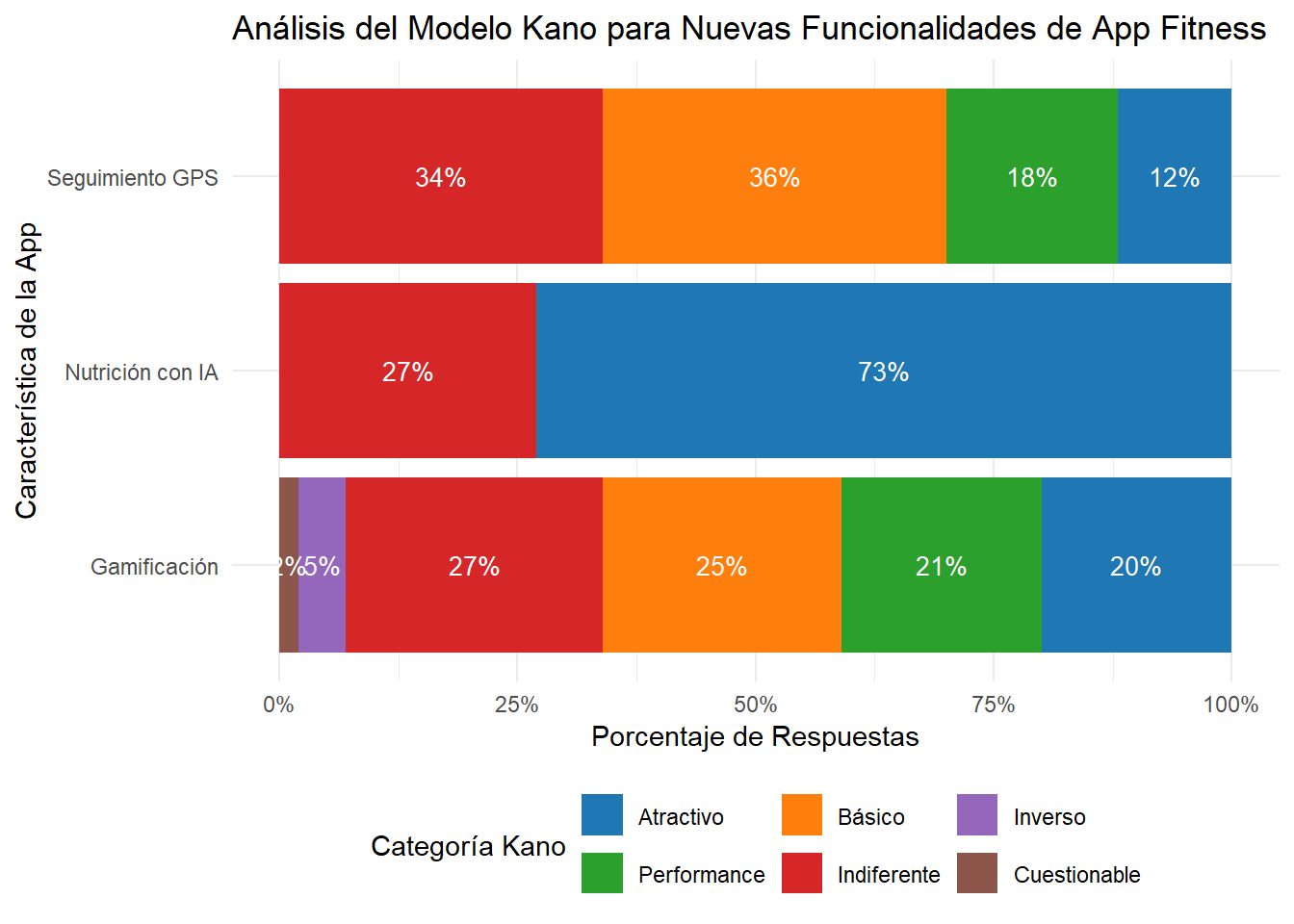 ggplot(kano_summary, aes(x = conteo, y =reorder(caracteristica, conteo), fill = categoria_kano)) +geom_bar(stat ="identity", position ="fill") +geom_text(aes(label =ifelse(conteo >0, paste0(round((conteo/100)*100), "%"), "")), position =position_fill(vjust =0.5), size =3.5, colour ="white") +scale_x_continuous(labels = scales::percent) +scale_fill_manual(values =c("Atractivo"="#1f77b4", "Performance"="#2ca02c", "Básico"="#ff7f0e", "Indiferente"="#d62728", "Inverso"="#9467bd", "Cuestionable"="#8c564b")) +labs(title ="Análisis del Modelo Kano para Nuevas Funcionalidades de App Fitness",x ="Porcentaje de Respuestas",y ="Característica de la App",fill ="Categoría Kano" ) +theme_minimal() +theme(legend.position ="bottom")