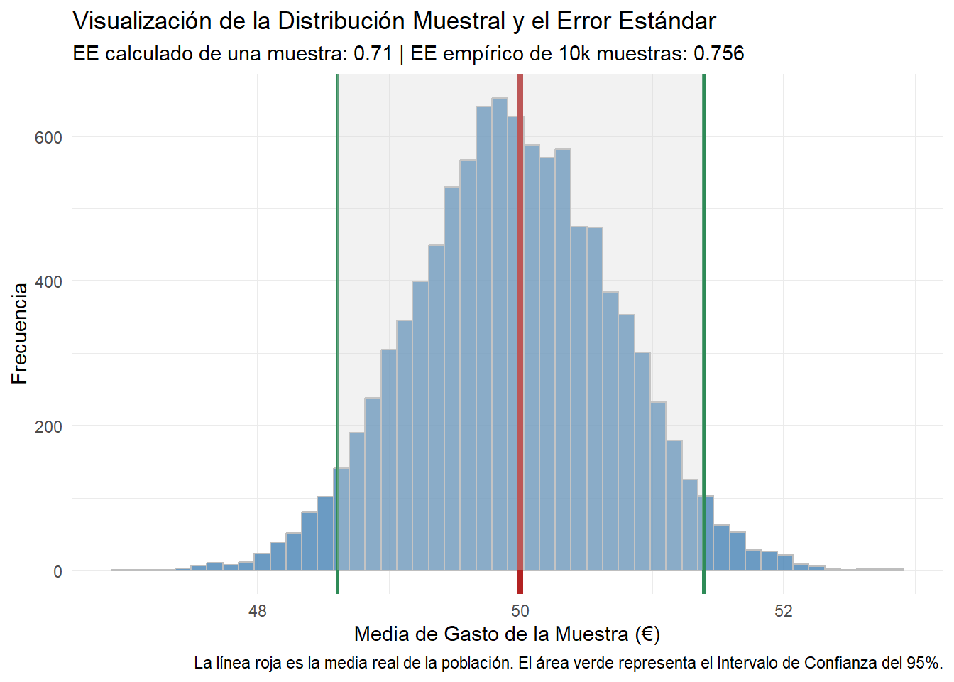 Fíjate: nuestra media muestral (50.51€) está cerca, pero no es exactamente igual a la media real (50.04€). El Error Estándar calculado es de 0.74€.