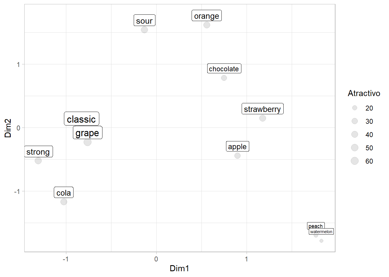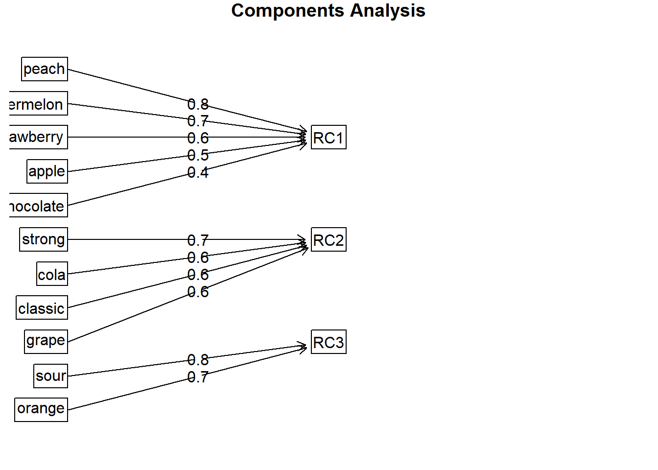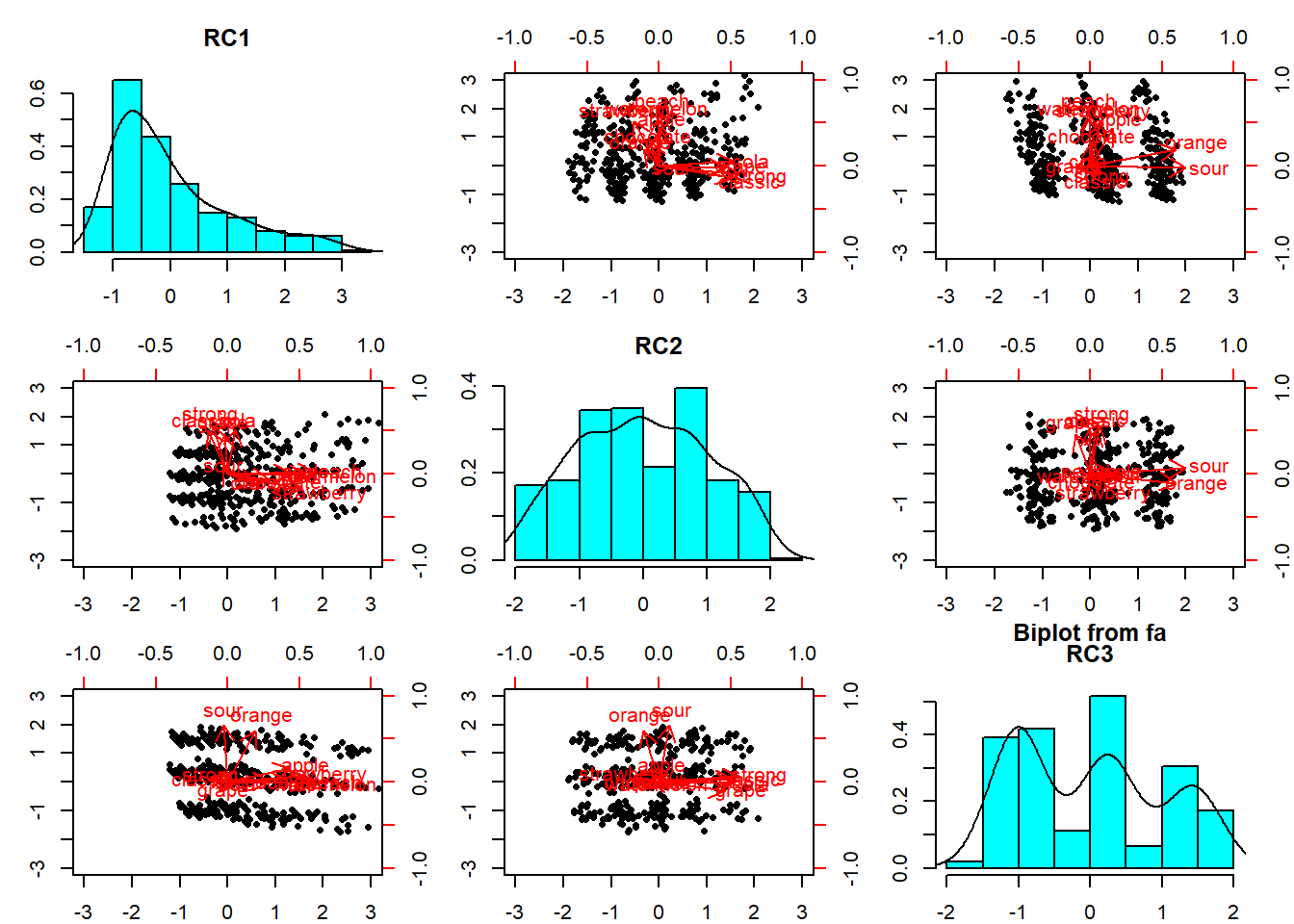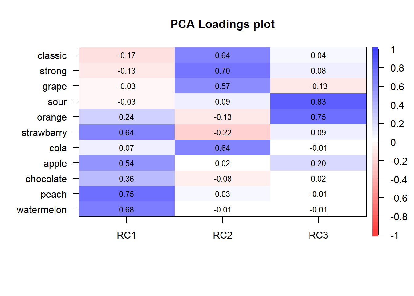 Las cargas para los datos se muestran a continuación y sugieren que hay tres grupos básicos de sabores: ácidos, tradicionales y los sabores de fruta y chocolate. Esto sugiere que deberíamos considerar tener uno de Sour / Orange en nuestro portafolio. Como Sour está más lejos de Strawberry (ver el análisis de correspondencia). Esto respalda aún más la opinión de que Classic + Sour + Strawberry + Cola es la mejor cartera. Los gráficos derivados de este nuevo análisis, nos revelan la estructura subyacente de los datos analizados.